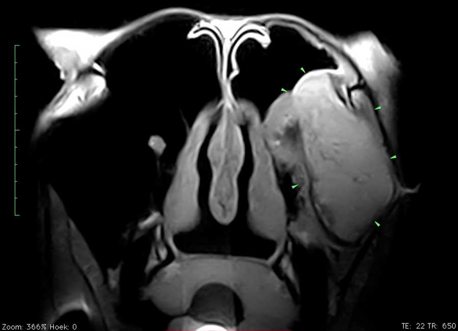 Dit paard had sinds enkele weken een unilaterale bloederige neusvloei. Op endoscopisch onderzoek was slechts een minimale afwijking ter hoogte van het linker ethmoid te zien. Bij radiografisch onderzoek was een grote massa in de sinus te zien. Er werd beslist een pre-operatieve MRI uit te voeren om de operatie te plannen en ook prognose beter te kunnen inschatten. Het ethmoid hematoom (PEH) bleek een groot deel van de linker sinus ingenomen te hebben.