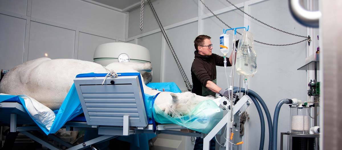 Het hoogtechnologische toestel van EquiSound kan een paard zowel in een rechtstaande als liggende positie scannen. De ondervoet onderzoeken we bijvoorbeeld terwijl het paard recht blijft staan. Om bijvoorbeeld de achterknie te scannen, brengen we het paard dan weer even onder narcose (algemene anesthesie). Dit is noodzakelijk omdat het paard anders te veel beweegt. Elke opname neemt immers 3 tot 6 minuten in beslag. Van paarden onder algemene anesthesie kunnen we bovendien beelden maken met een hogere resolutie. Zo kan de prognose voor uw paard nog beter ingeschat worden. Een geassisteerde recovery zorgt ervoor dat het paard veilig ontwaakt.